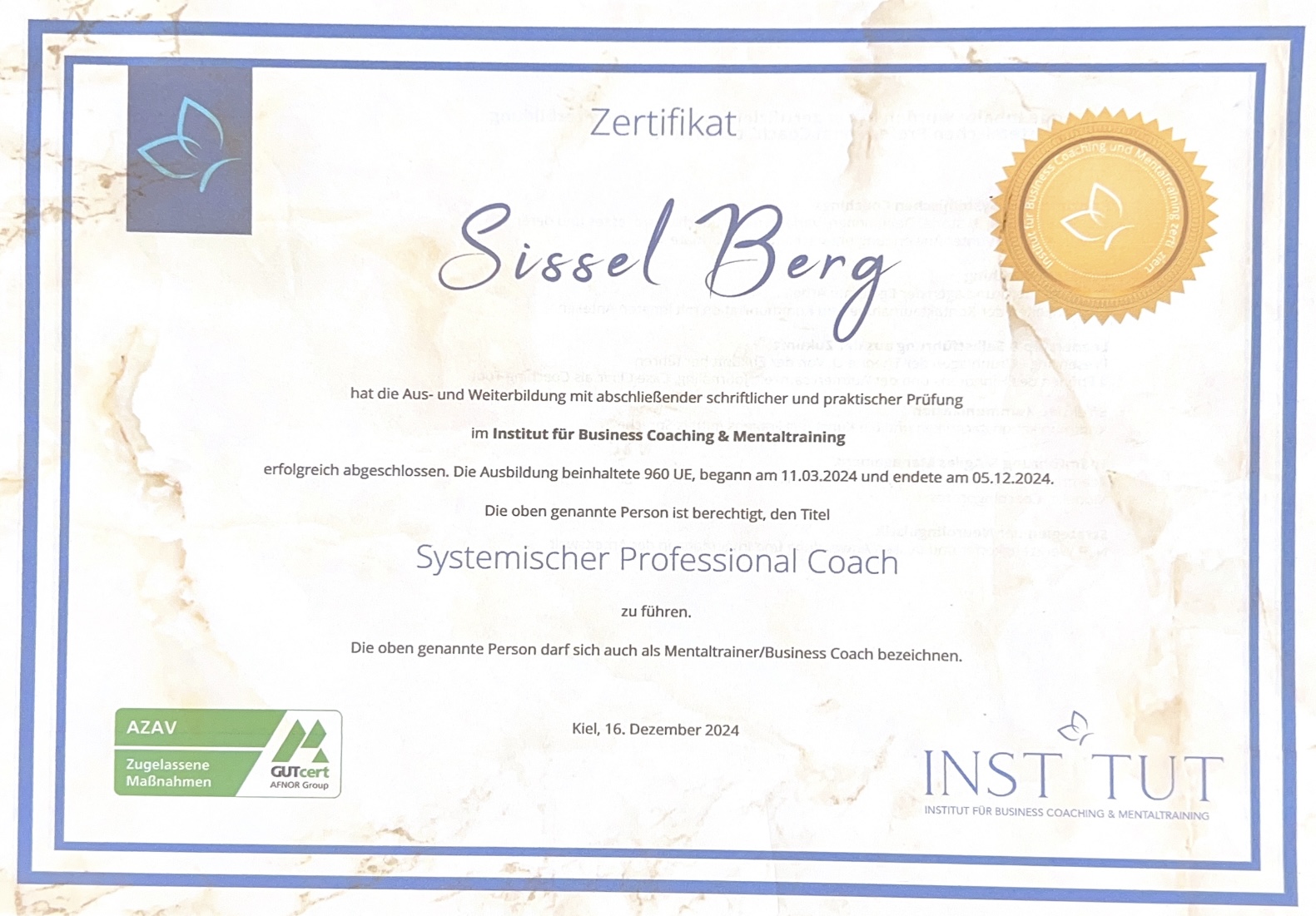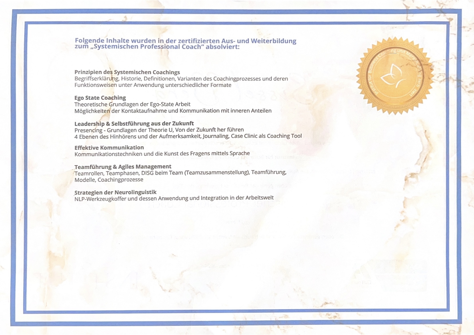 - Zertifizierter systemischer Professional Coach ( Institut für Buisness Coaching & Mentaltraining )
