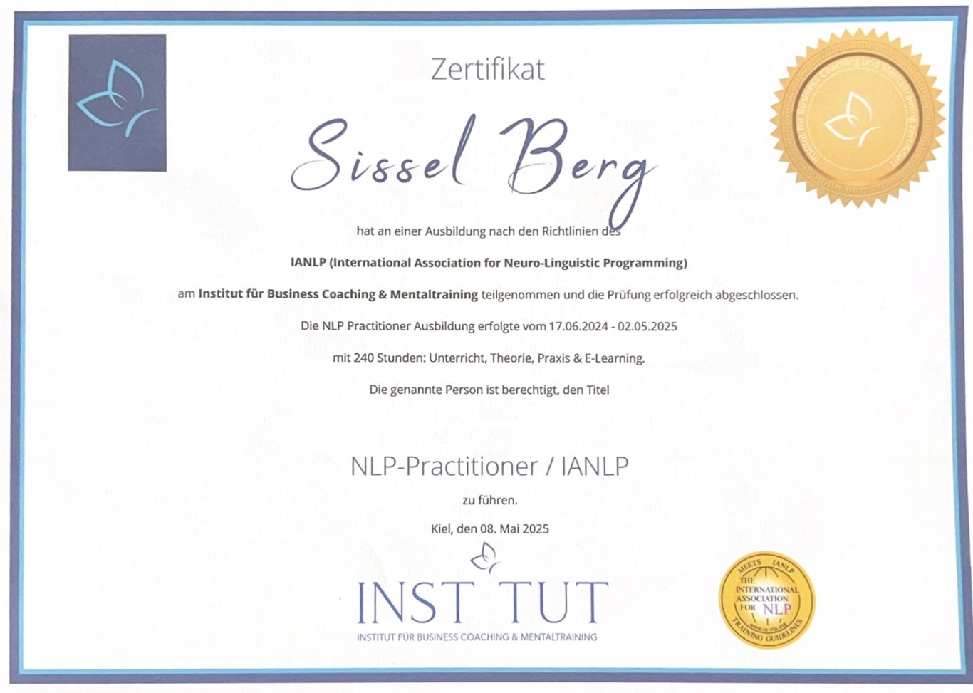 - Zertifizierter NLP Practitioner ( Institut für Buisness Coaching & Mentaltraining )